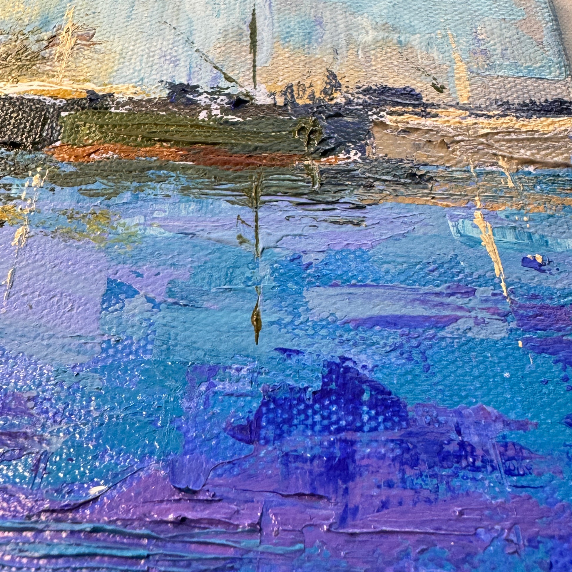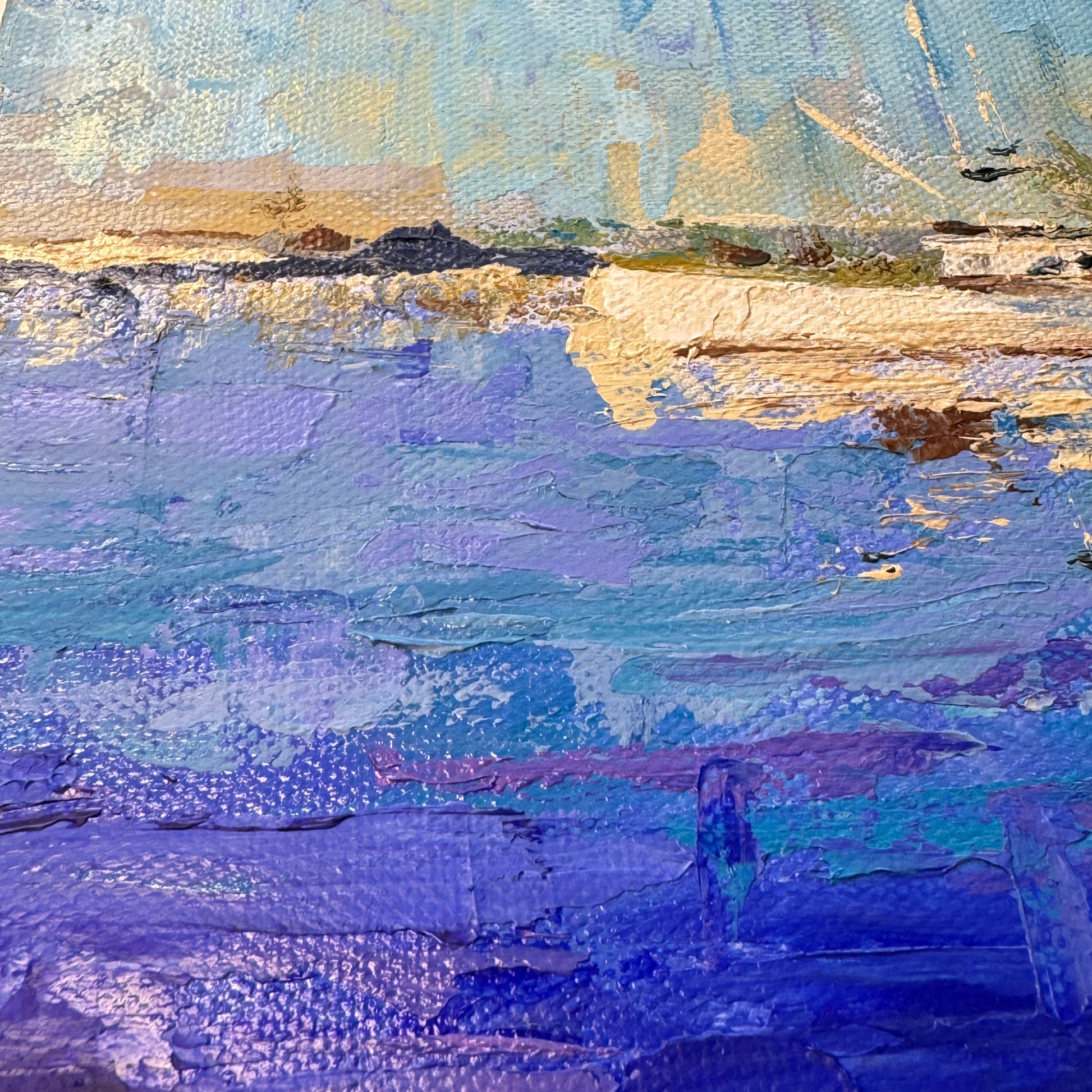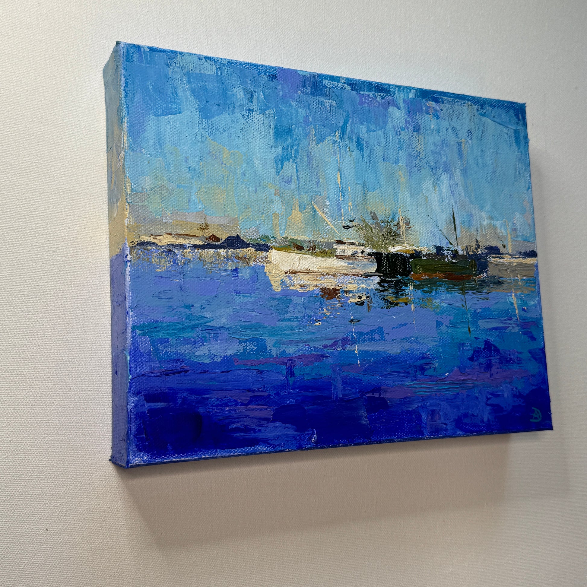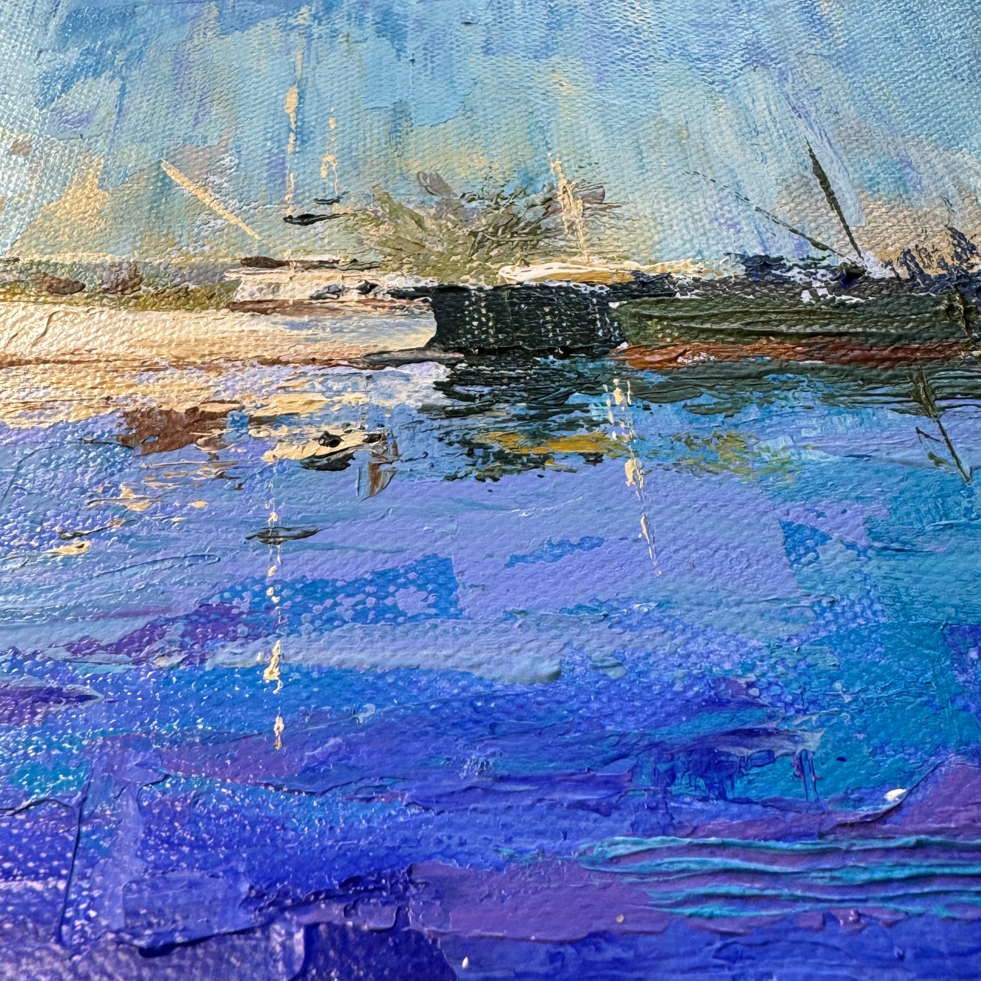 Find your serene place with this coastal artwork depicting boats on the Piscataqua river in Portsmouth, NH. Worked in palette knife, the painting captures the essence of the seascape, the silent reflections in the water, the bright daylight colors.