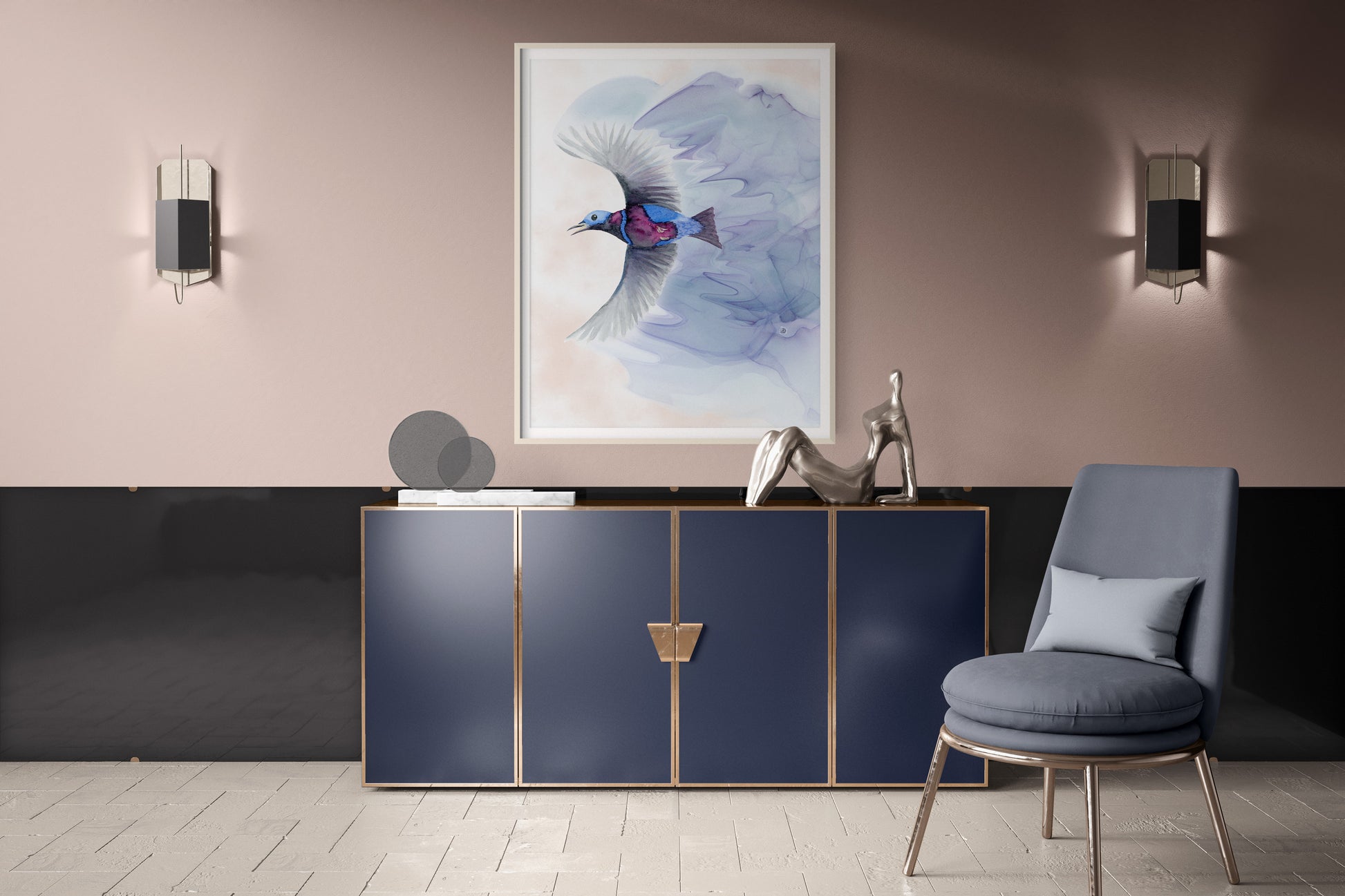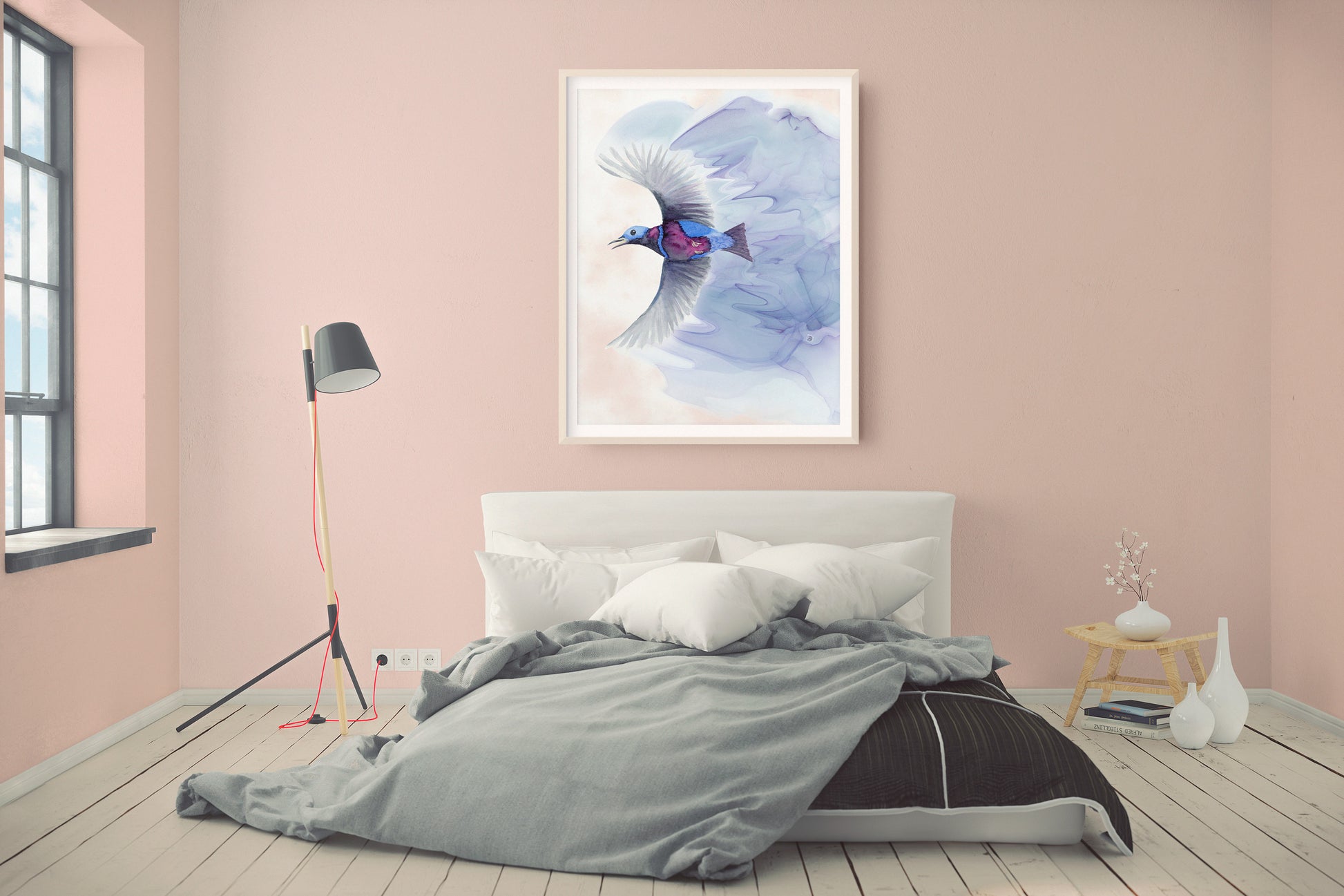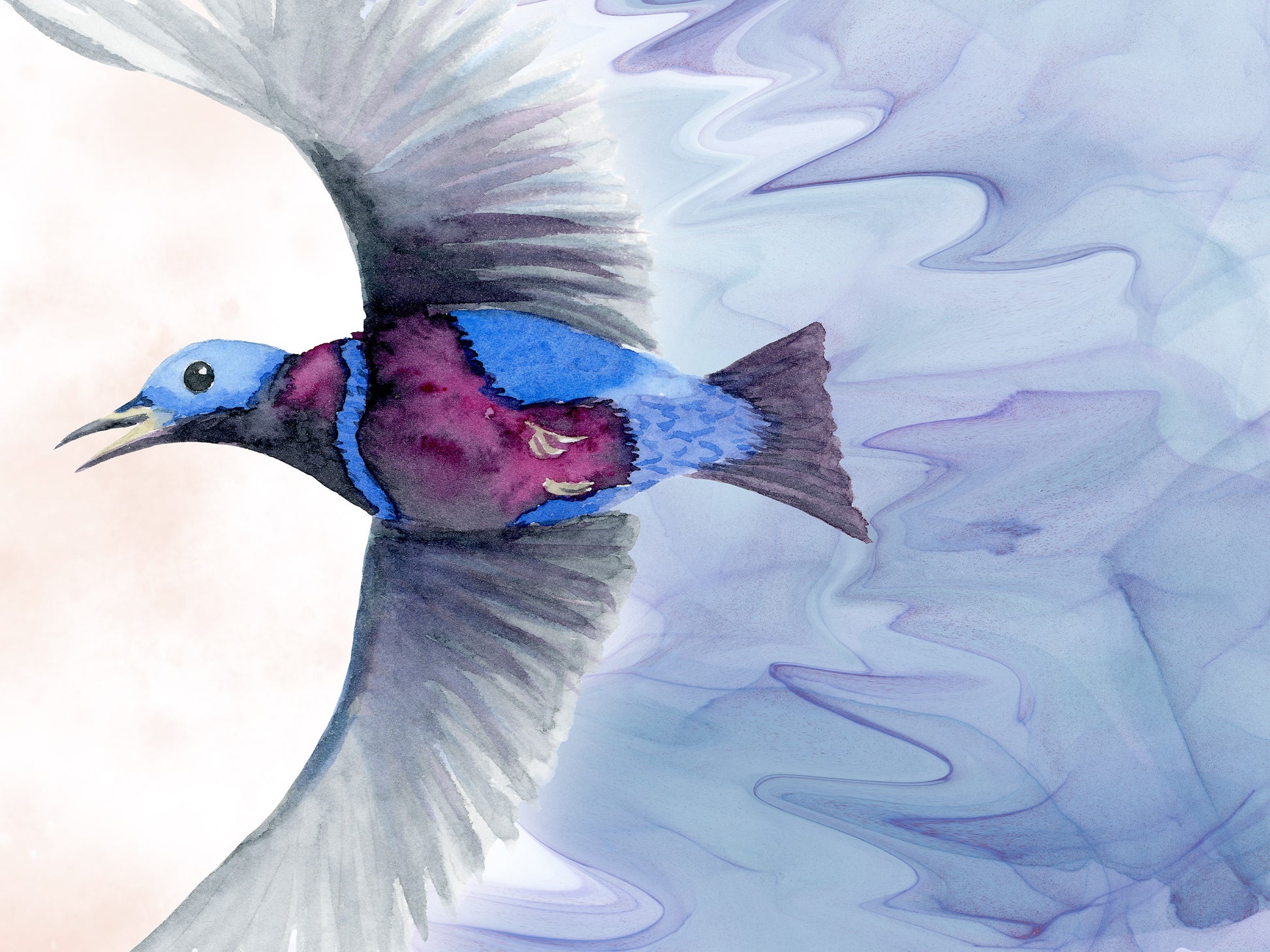 Banded Cotingas are expressive and beautiful birds, with cobalt-blue and purple plumage. They live mostly in the humid forests of the Brazil. When I created this artwork, I was reminded of the freedom that birds have, but I also wanted to convey the symbolic meaning of open wings, leaving behind ephemeral trails.