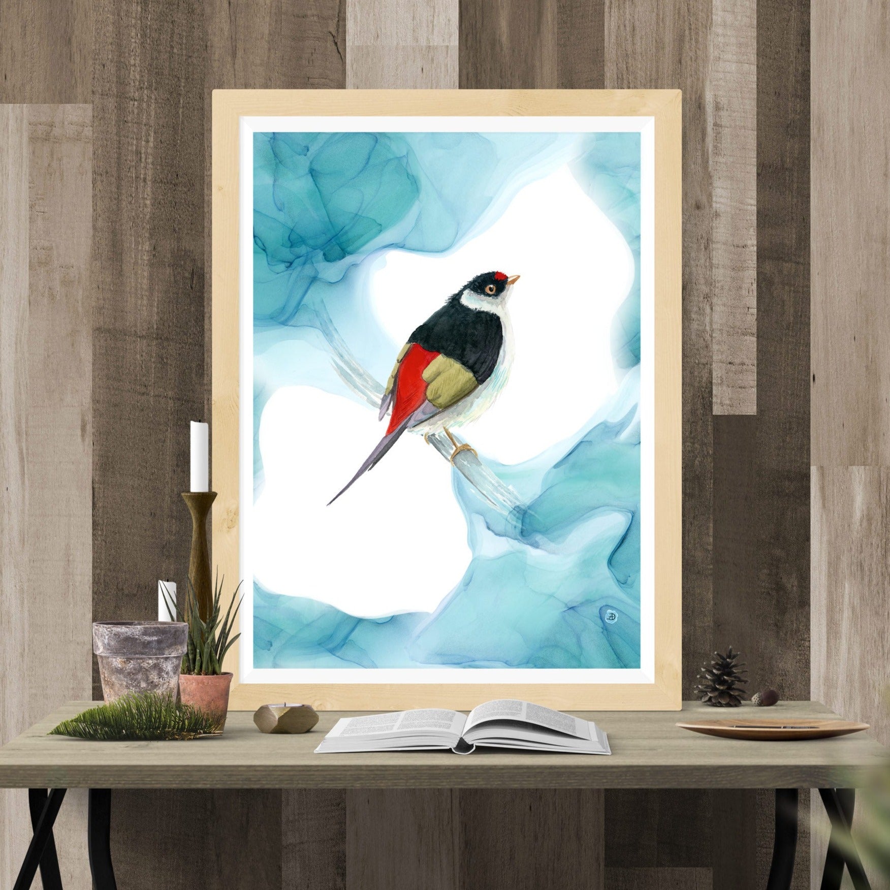 Pin-tailed Manakins are cute little tropical birds with a lively personality. Colorful like warblers, they have intricate dance displays, some of them akin to gymnastics, and their singing is accompanied by snapping sounds while the jump through the air. They have a striking color design, with black, white, red and olive-green colors adorning their plumage. If you are looking for bird lovers gifts, this is a precious work of art to be treasured.