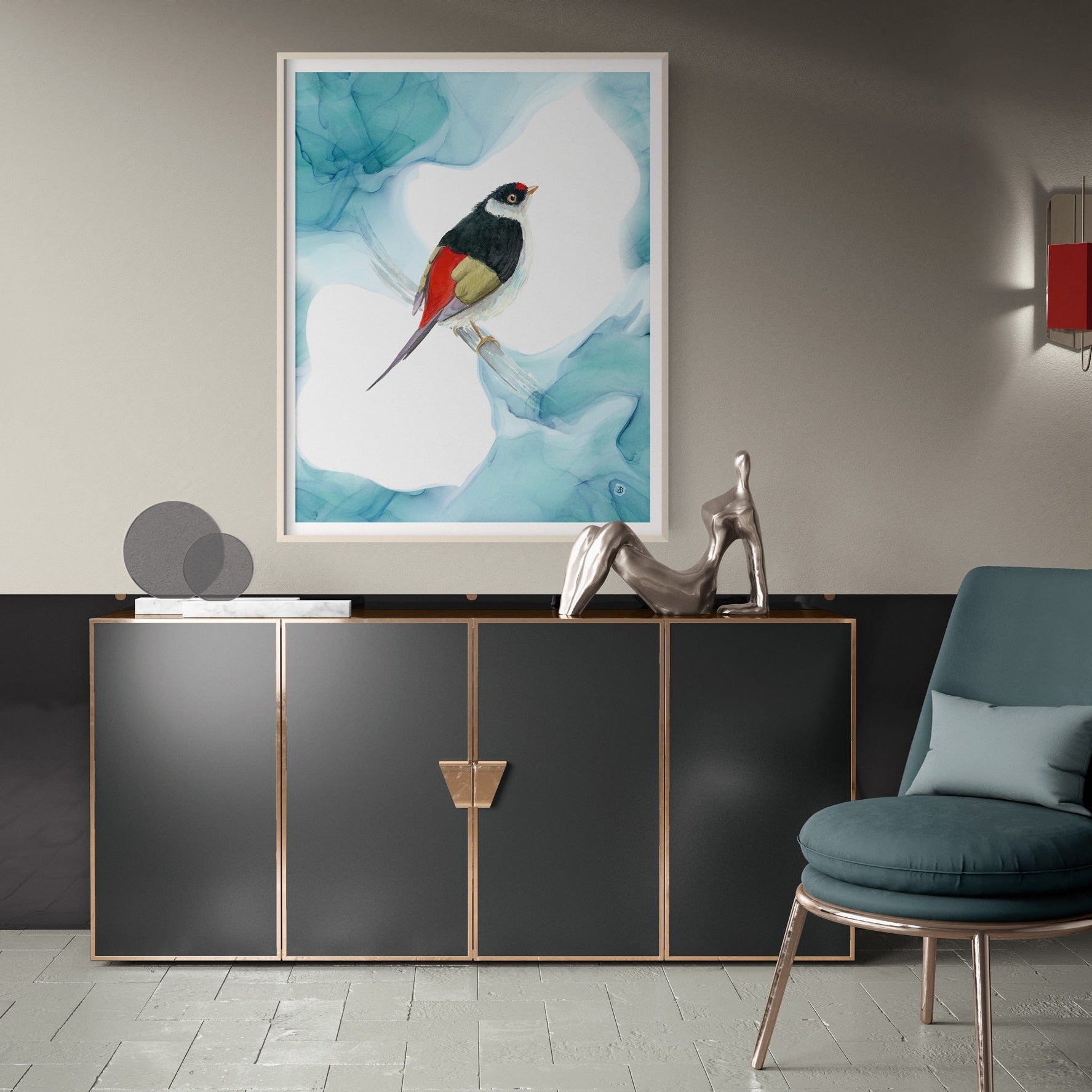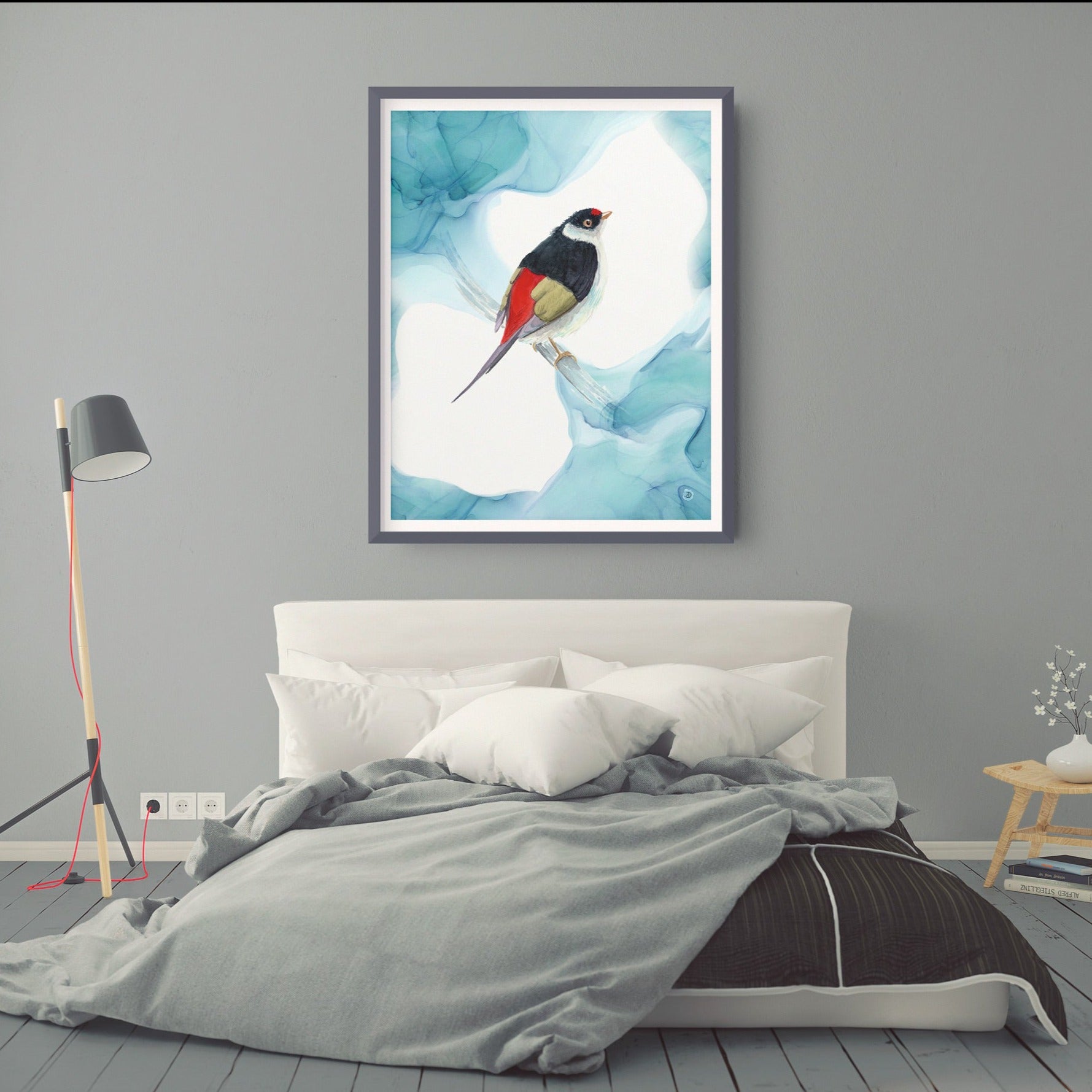 Welcome to my little bird corner! By bringing this colorful artwork into your space, you'll discover that it comes with its own character and becomes a statement piece on your wall.