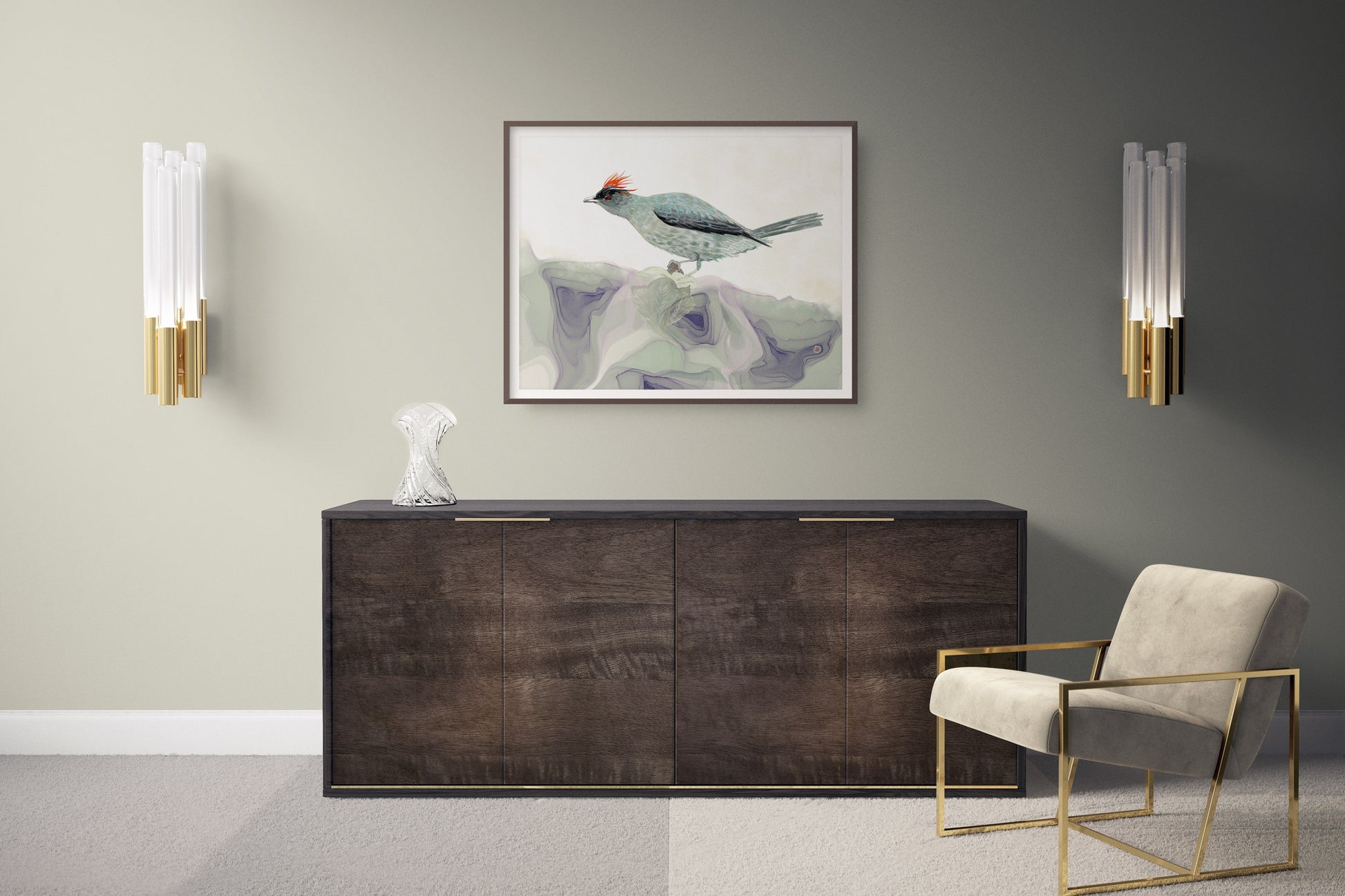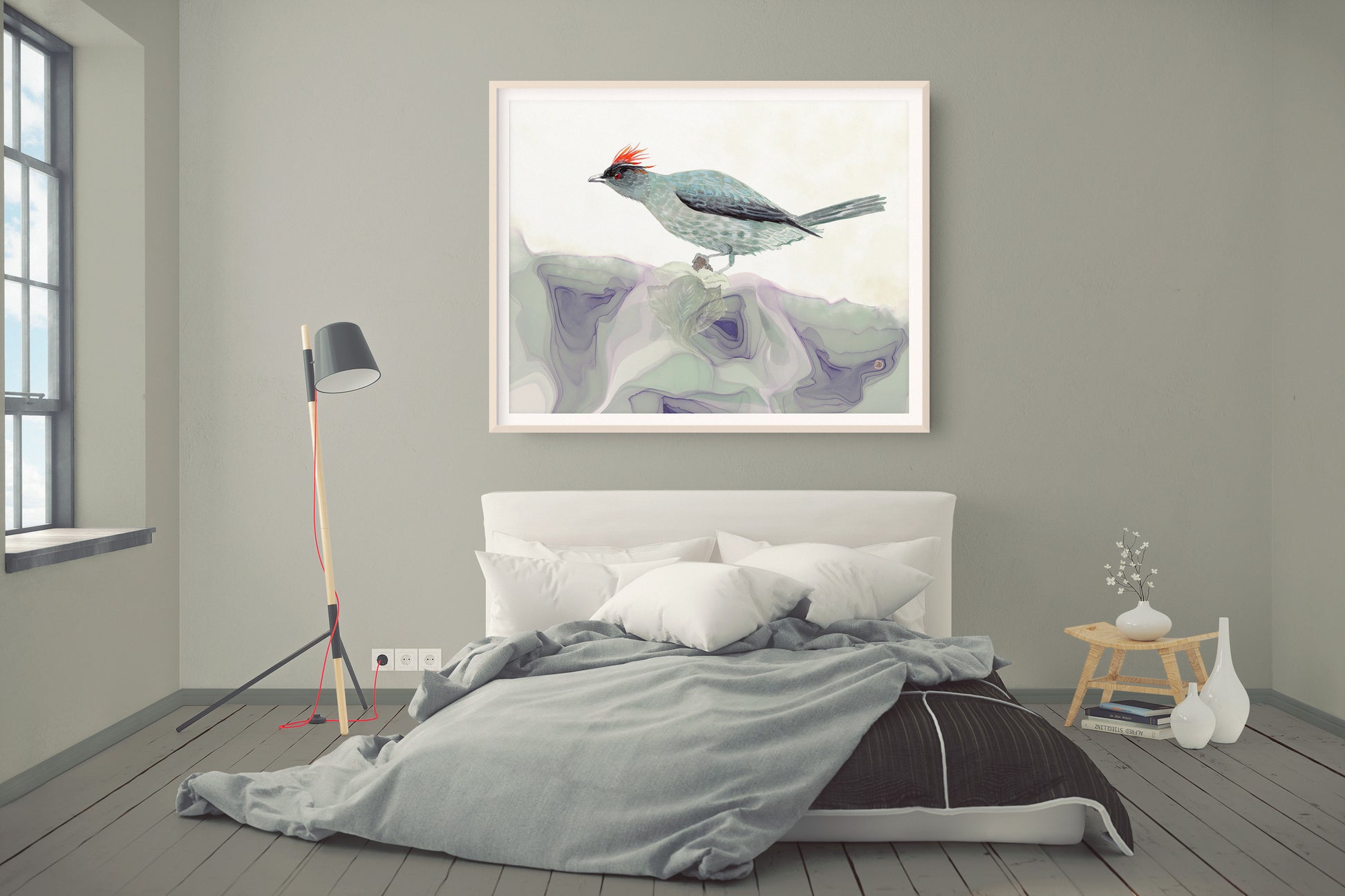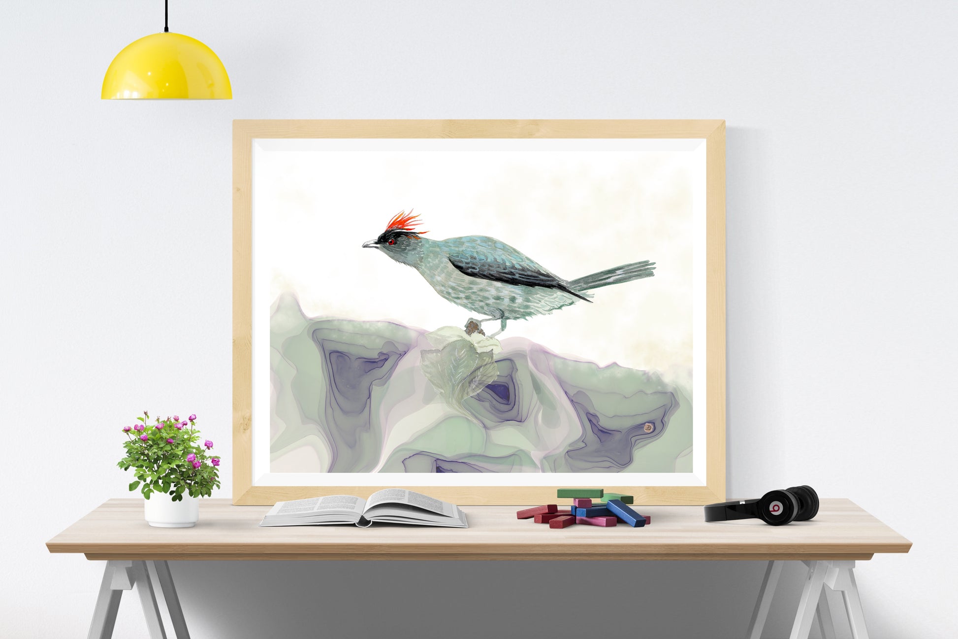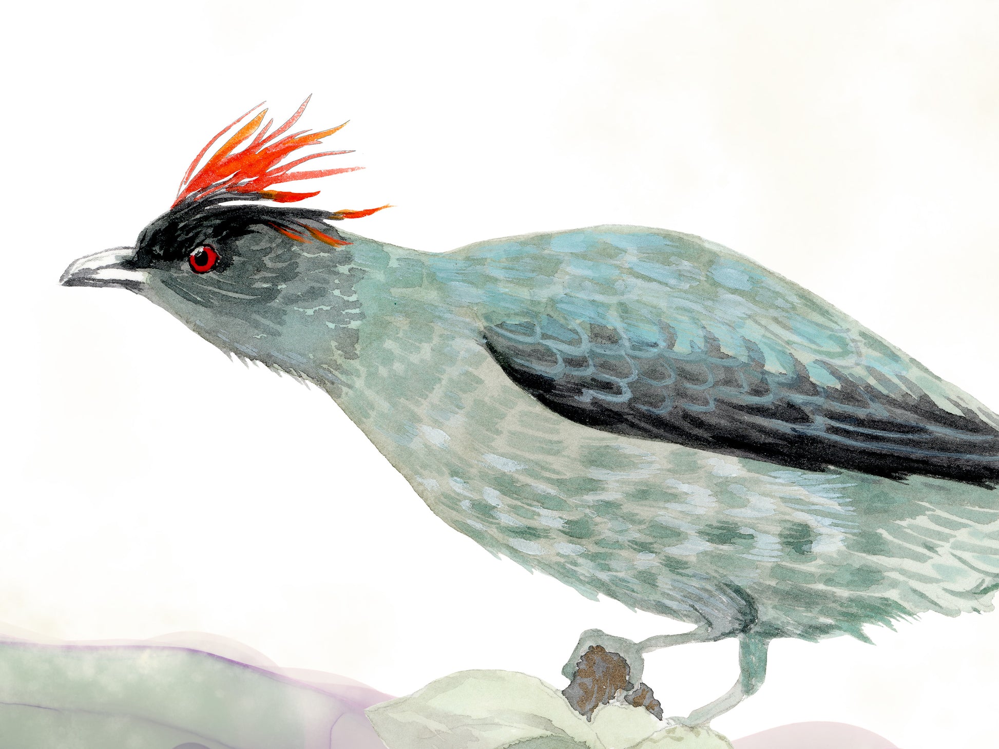 If you are a bird lover who enjoys exploring subtle colors and nuances, take a closer look at this artwork. This bird is called a Red-crested Cotinga and it has a lovely grayish plumage with a red crest raised in an attractive display. Sometimes, depending on the atmosphere and the time of the day, the feather colors can shift into olive or azure tones, and I enjoyed exploring the green earth palette.
